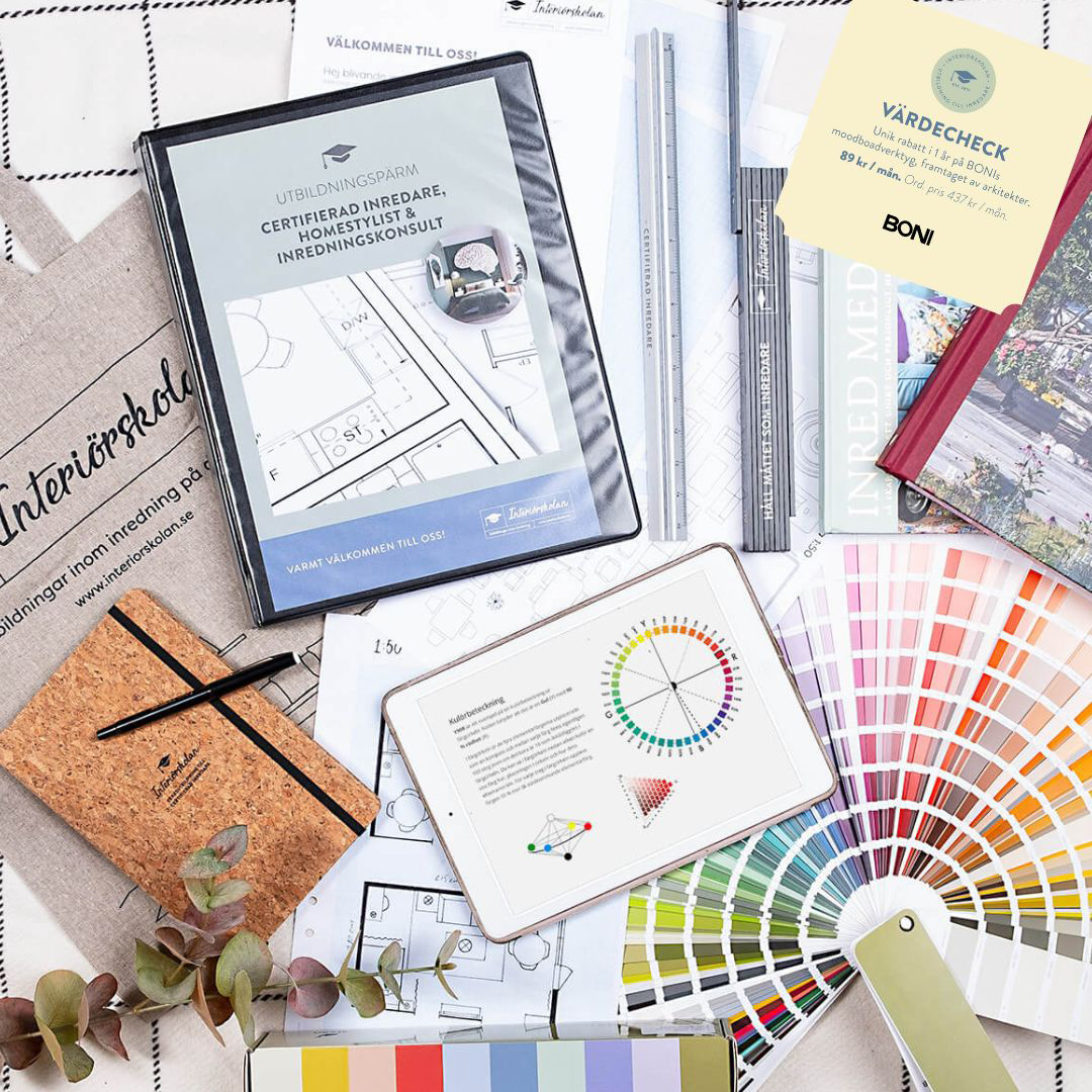 Just nu får du en unik rabatt (89 kr/mån. istället för 437 kr/mån.) på BONIs moodboard-verktyg i ett år när du köper en utbildning till Certiferad Inredare. Dessutom ingår kursen "Starta eget som inredare" och ett stort avsnitt om Neurodesign (värde 9.900 kr) när du beställer utbildningen.